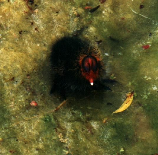 Na 3 tot 4 dagen verlaten de jongen het nest. Pas uit het ei heeft het meerkoet jong een opvallende rode kop.